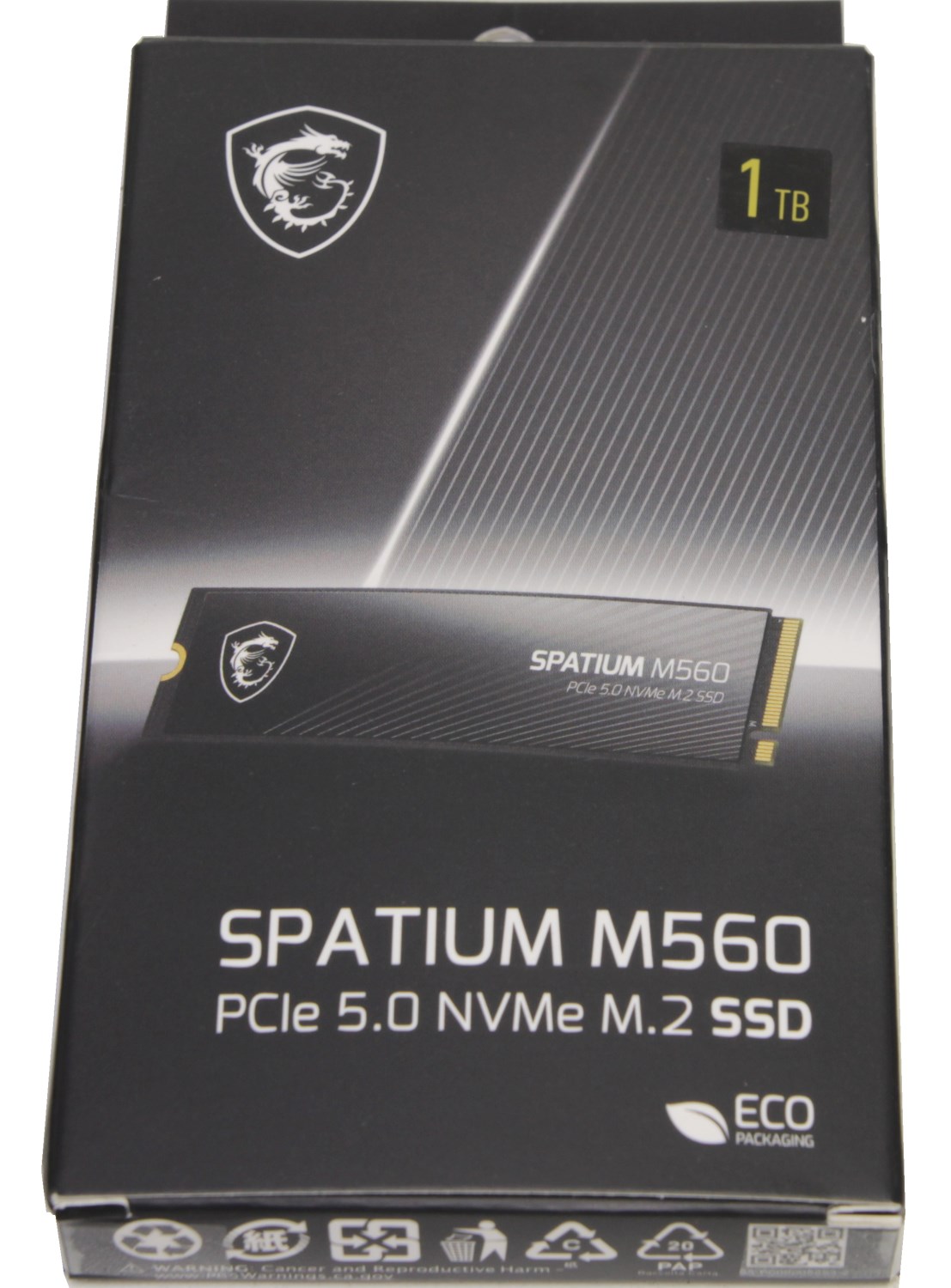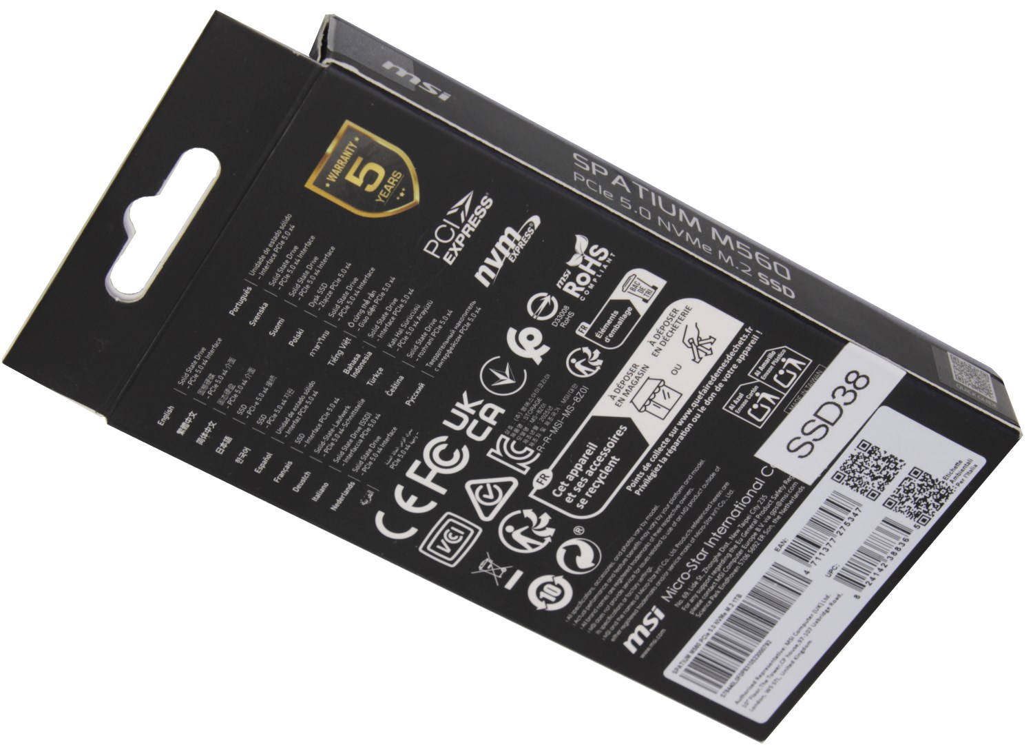 Накопитель MSI Spatium M560 поставляется в небольшой коробке. Она изготовлена из тонкого плотного картона, фон преимущественно тёмный. Это уже не флагман, но всё ещё достаточно современное и быстрое устройство, которое предполагает работу с интерфейсом PCI-e x4 Gen5.