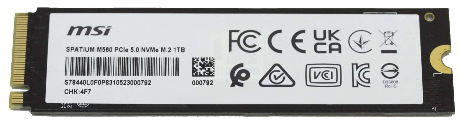 Спереди мы снова видим фрагмент изображения накопителя. Тут нет ничего необычного и сверху можно заметить лишь декоративную наклейку. Радиатора нет, и даже в комплекте он отсутствует. В левом верхнем углу находится логотип серии MSI Gaming. Возможно, накопитель в первую очередь рассчитан на геймеров, ведь игры становятся всё более объёмными, а при таких размерах важной становится скорость загрузки. Поэтому сейчас уже без быстрого накопителя комфортно не поиграешь. А вот информации о скоростных характеристиках нового устройства как раз спереди обнаружить не удалось. Внизу лишь указано, что это PCI-e 5.0 NVMe M.2 накопитель, который называется Spatium M560.
