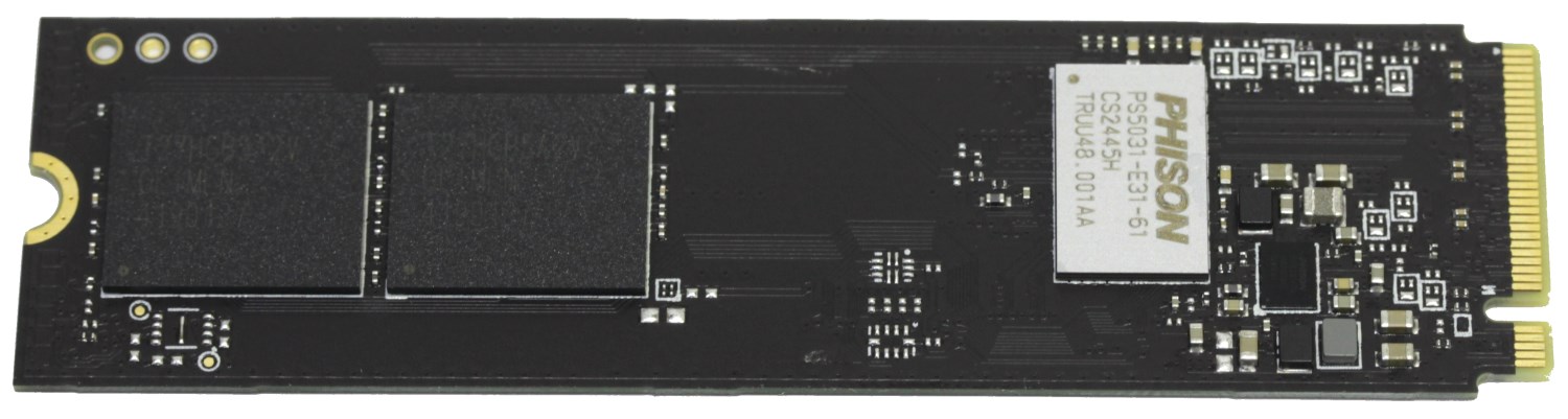 Также спереди распаяны два чипа 218-слойной памяти типа 3D NAND TLC производства компании Toshiba/KIOXIA. Вместе они образуют ёмкость 1000 Гбайт. Существует ещё модификация на 2000 Гбайт.