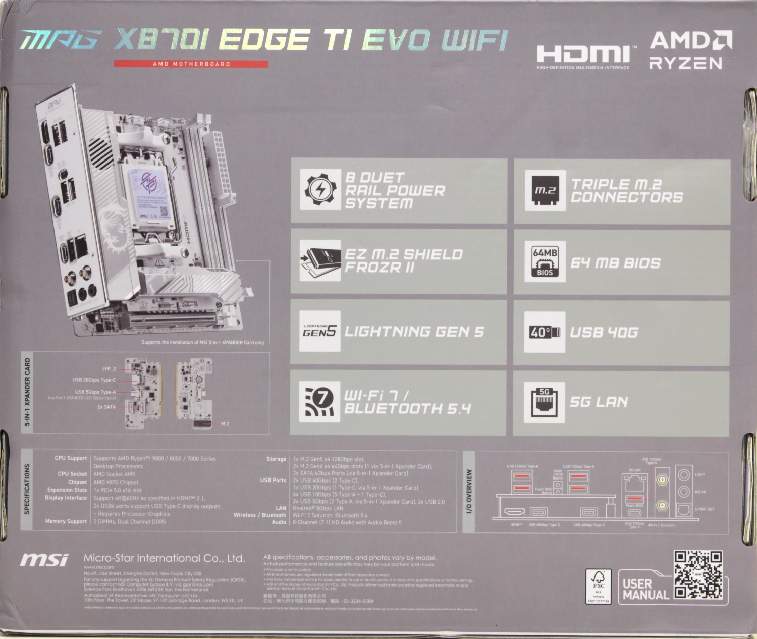 MSI MPG X870I Edge TI EVO WIFI – это безусловно одна из лучших компактных материнских плат для платформы AMD Socket AM5. Можно было предположить, что это просто немного улучшенная MSI MPG B850I Edge TI WIFI, но на самом деле они абсолютно разные. Здесь производитель перешёл в вертикальную плоскость и для этого придумал специальный разъём с вертикально устанавливаемой дочерней платой, на которой присутствует несколько портов расширения. Также в комплекте с чипсетом AMD X870 поставляется контроллер USB 4.0. Возможно, именно поэтому кто-то выберет эту плату, а не аналог попроще с чипсетом AMD B850.