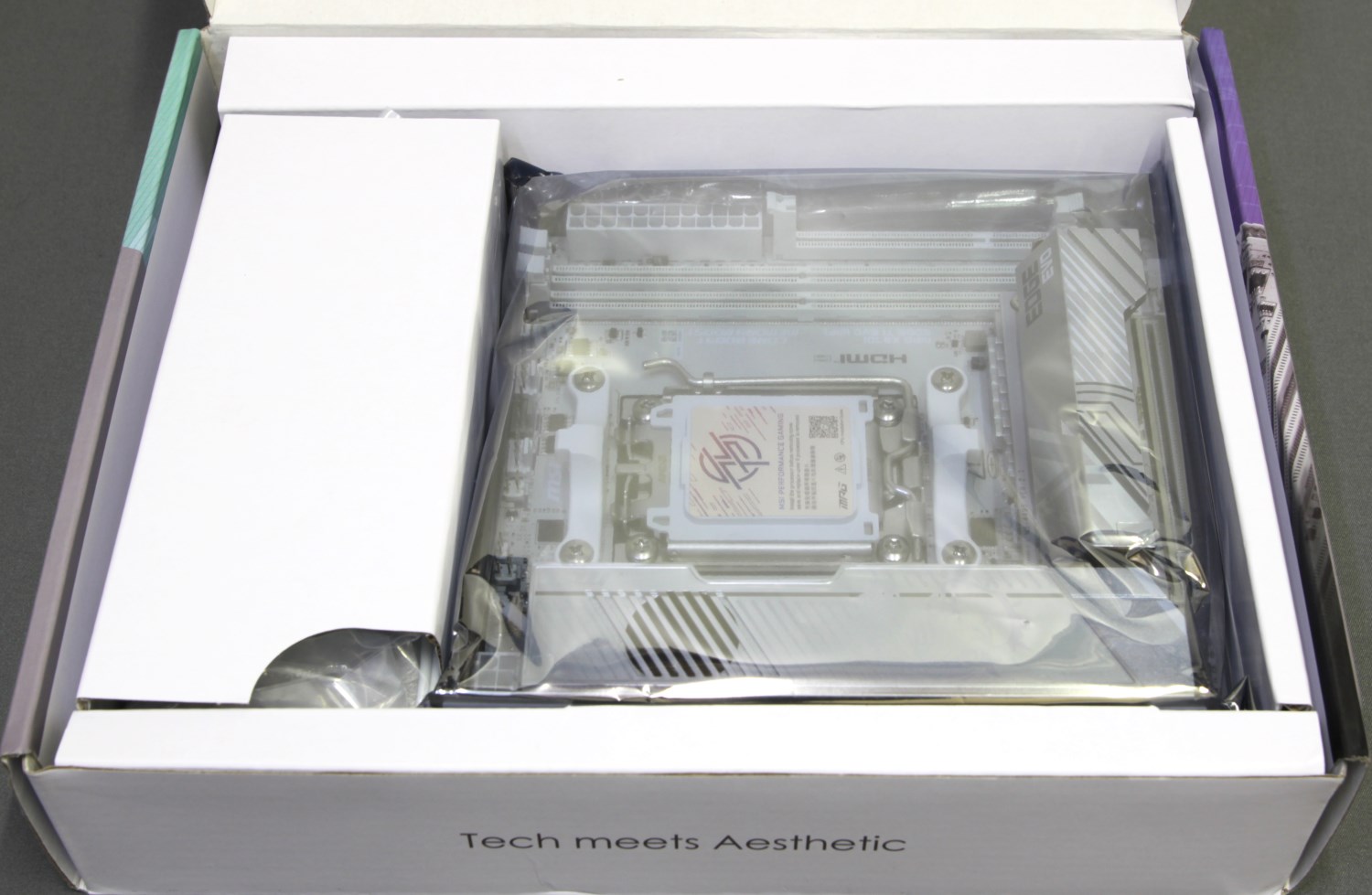 Пора открыть упаковку. Здесь мы видим белый картонный лоток с разделителем. В правой части лежит материнская плата в антистатическом пакете, а слева и сверху находятся отсеки, где размещается комплект поставки.