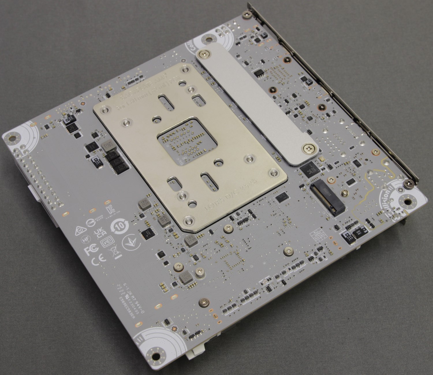 Под дочерней платой находится ещё один радиатор, который предназначен для охлаждения чипсета. Он крепится к материнской плате с обратной стороны при помощи четырёх винтов жёстко.