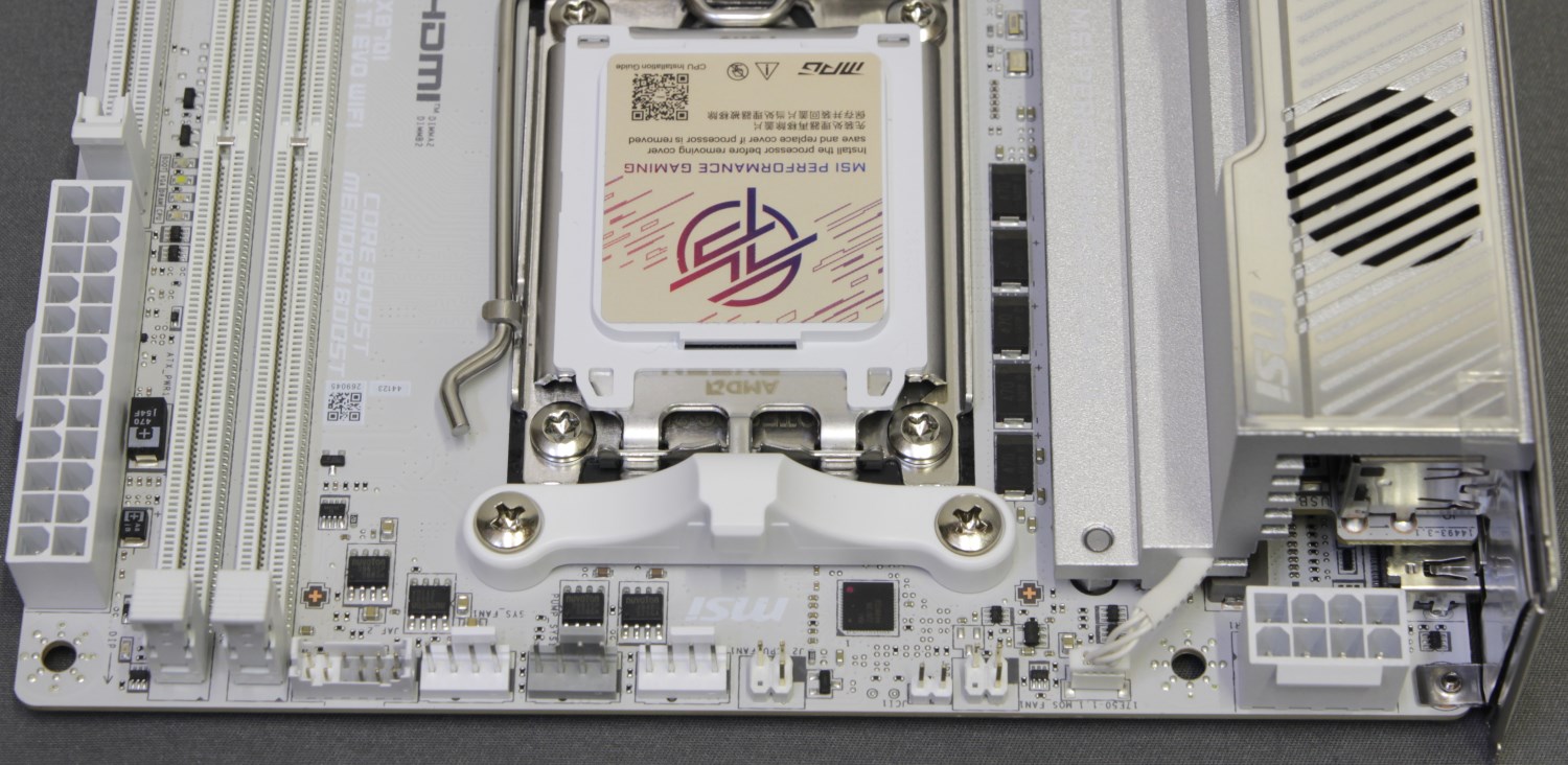 В правом верхнем углу опять есть предупреждающая наклейка, чтобы дети не ели батарейки CR2032. Посередине крупными серебристыми переливающимися символами обозначено наименование модели MSI MPG X870I Edge TI EVO WIFI. На фрагменте изображения материнской платы можно заметить обновлённый логотип серии MSI MPG.