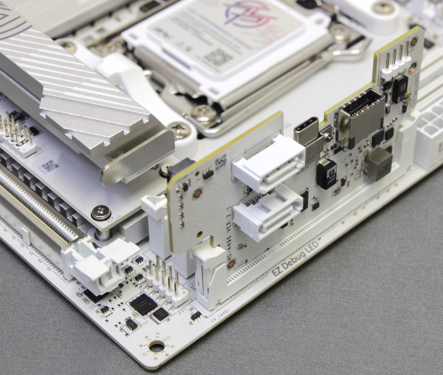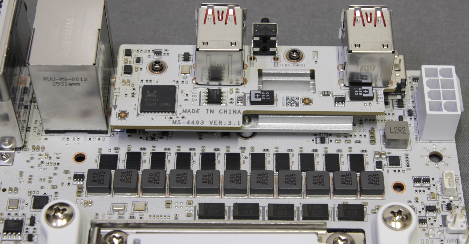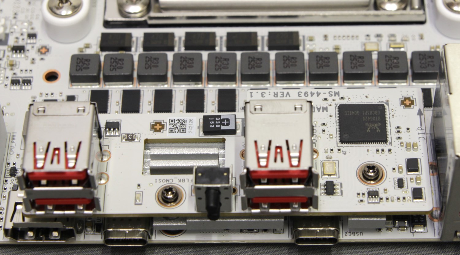 Над ним вторым ярусом стоит маленькая дочерняя плата с портами USB 3.2 Gen2. В ней есть отверстие, через которое виднеются рёбра радиатора. Вентилятор в основном радиаторе стоит напротив него и соответственно нагнетает туда поток воздуха.