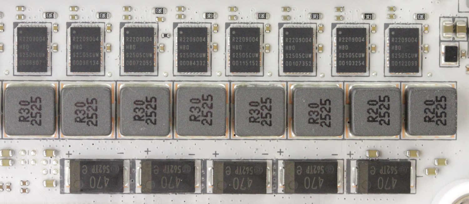 На каждый из основных 10 каналов приходится по одной ферритовой катушке индуктивности и по одной SPS (smart power stages) сборке Renesas RAA2209004. Они могут продолжительное время обеспечивать нагрузку до 110 А.