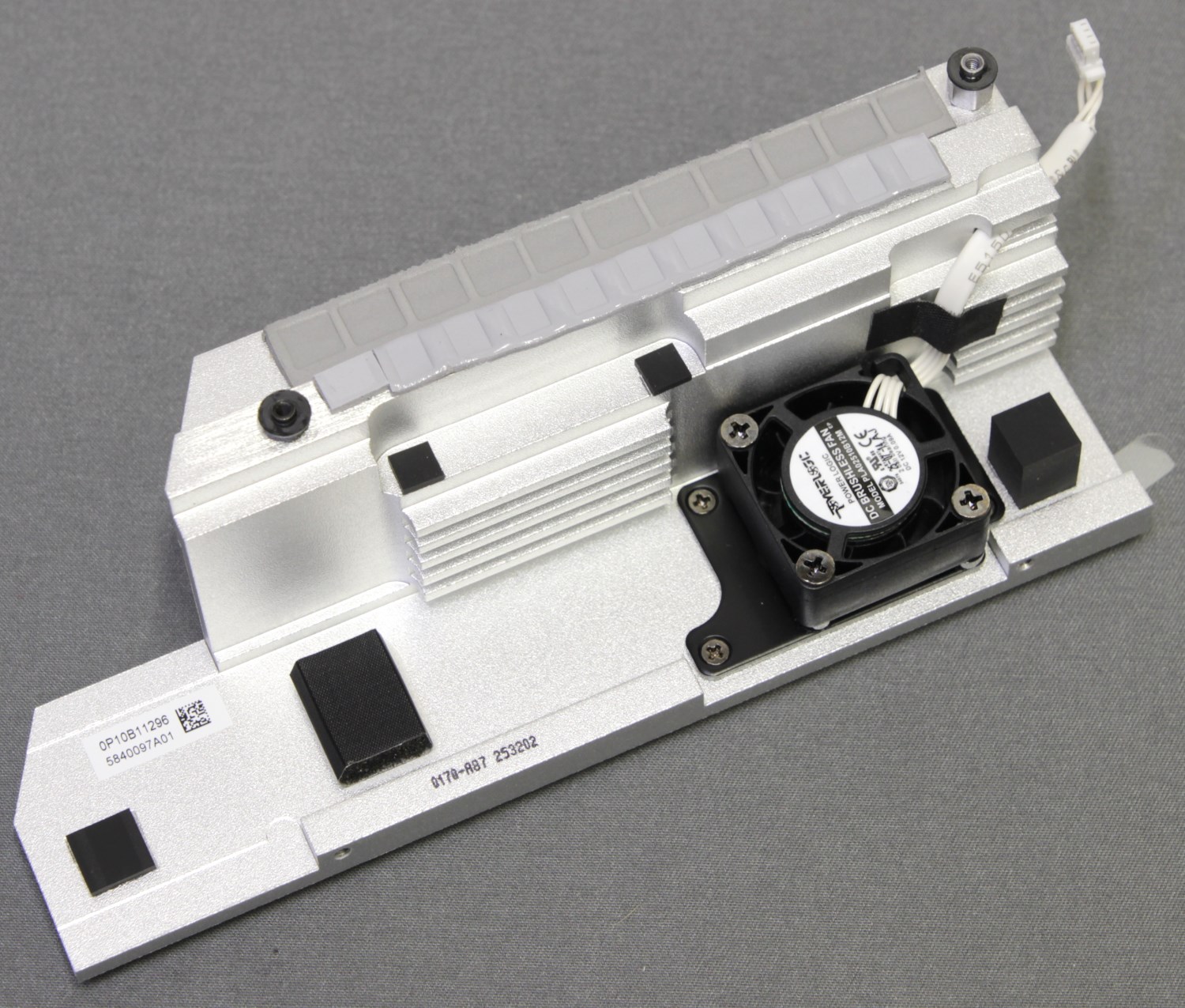 Ниже расположен ещё один такой бутерброд из радиаторов и плат. Верхний радиатор предназначен для охлаждения накопителя SSD M.2, который устанавливается в ещё одну дочернюю плату. В данном случае уже никакого активного охлаждения нет. Он оборудован быстросъёмным креплением на защёлке.