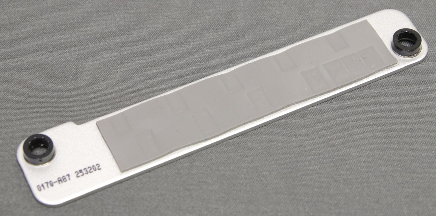 В качестве термоинтерфейса используются серые терморезинки толщиной около 1 мм. Они соприкасаются не только с транзисторными сборками, но и катушками индуктивности. Прижим хороший, что заметно по отпечаткам на них. Под ним находится ещё один небольшой радиатор, который предназначен для отвода тепла от контроллера USB 4.0.