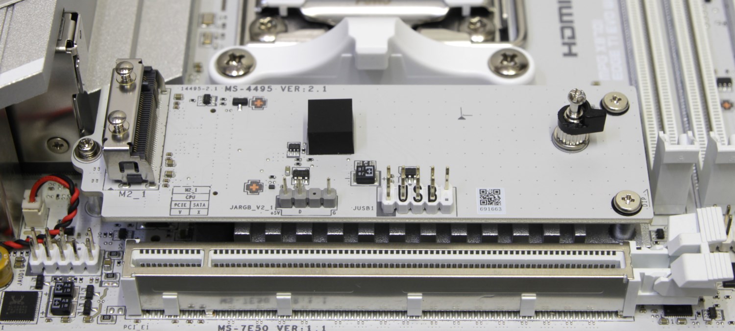 Сборка не вызывает каких-то сложностей. Я использовал воздушный кулер, а с жидкостным охлаждением должно быть ещё проще. Также я установил накопитель MSI Spatium M570 Pro, чтобы проверить работу интерфейса PCI-e x4 Gen5. Он встал без всяких проблем и его огромный радиатор сильно не мешался. Также я сразу установил вертикальную дочернюю плату, чтобы посмотреть будет ли она сильно мешаться. Оказалось, что в моём случае она ни с чем не конфликтовала, и даже если б я установил видеокарту, то она бы ей не мешала.