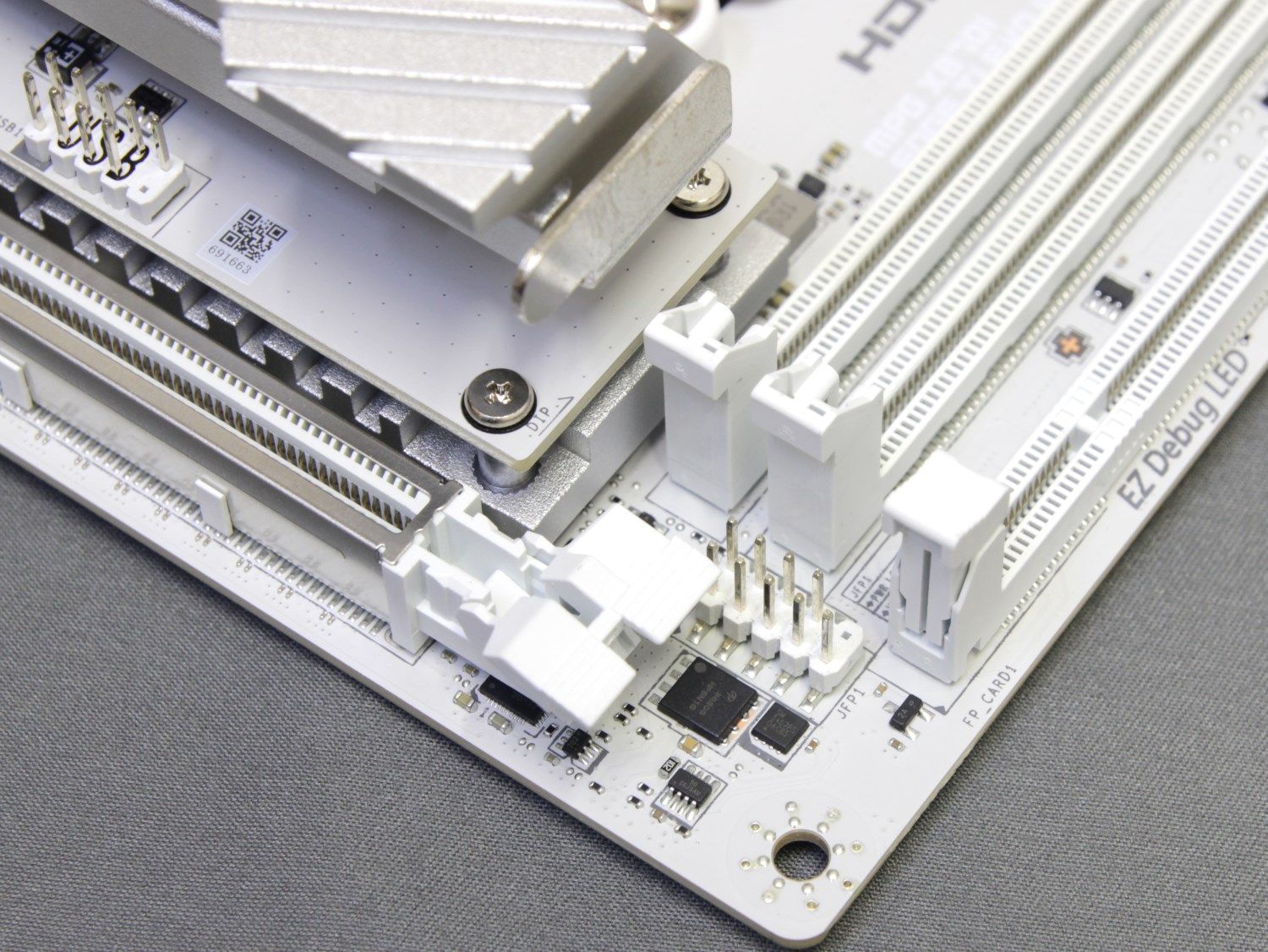 Сверху сама плата скорее молочно-белая, а сзади серая, но всё равно светлая. Ещё есть надписи и логотипы на радиаторах. Принты на поверхности также присутствуют. В основном это белые полосы на чуть менее белой основной поверхности. RGB-подсветки тут нет, ни на боковом радиаторе, ни на самой печатной плате.