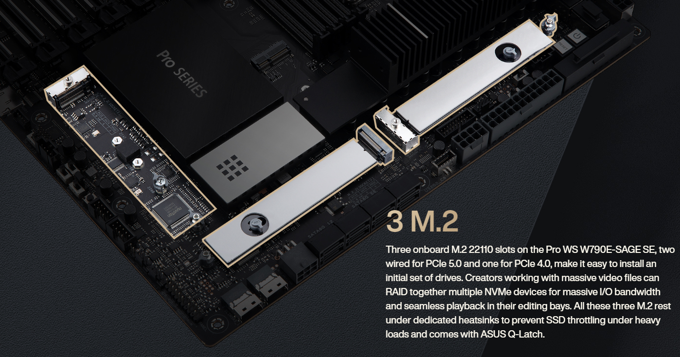 Для младшей серии с 4-мя каналами памяти и 64 линиям PCI-Express выбор сводится к двум платам: ASUS Pro WS W790-ACE и ASRock W790 Ws (существует две ревизии платы, R2.0 – упрощенная). А вот для процессоров с 8-ю каналами и 112 линиями PCI-Express выбор сводится к одной плате – ASUS Pro WS W790E-Sage SE.