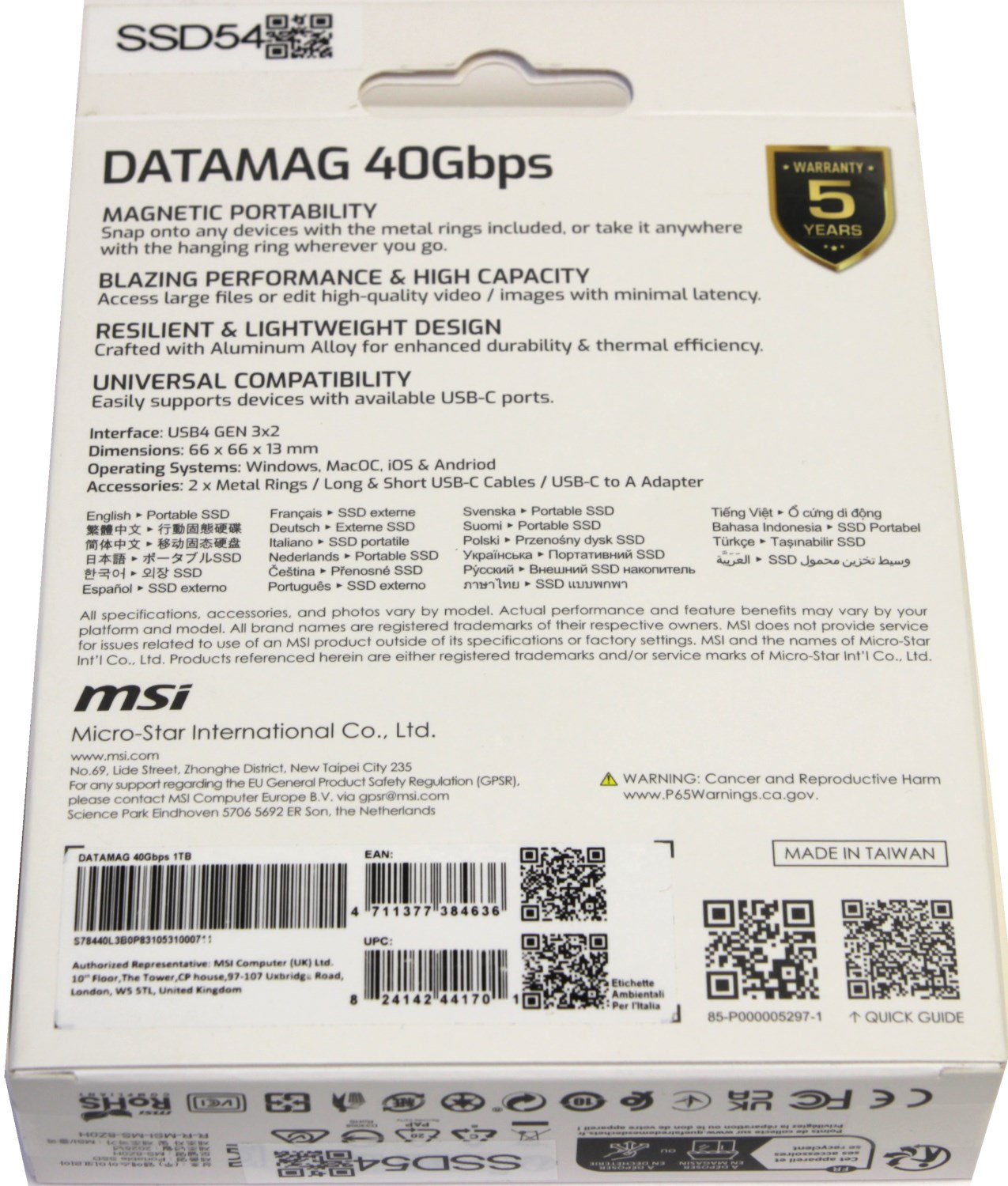 Я ожидал найти здесь спецификацию, но тут её нет. Сверху идёт четыре пункта, где описываются ключевые достоинства данного устройства. Сверху также есть значок, который указывает на пятилетнюю гарантию от производителя. Это очень солидный срок, и я больше переживаю за разъём USB Type-C, если устройство очень часто и интенсивно использовать, постоянно переключая кабель.