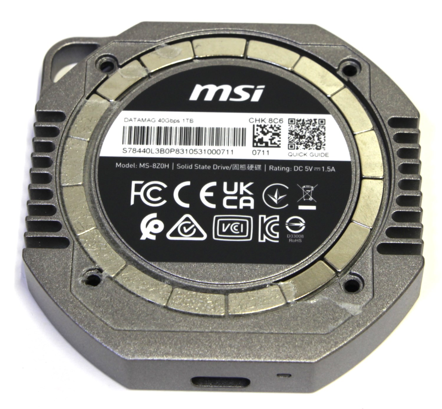 С обратной стороны по центру наклеена круглая информационная наклейка. Здесь указана модель, присутствуют штрихкод и QR-коды. Также есть информация по питанию устройства. Это 5 В, 1.5 А, которые подаются по интерфейсному кабелю. Как быть с теми портами, которые выдают только 500-700 мА? Об этом ничего не известно, но знать это важно, если ваш диск при подключении не определяется.