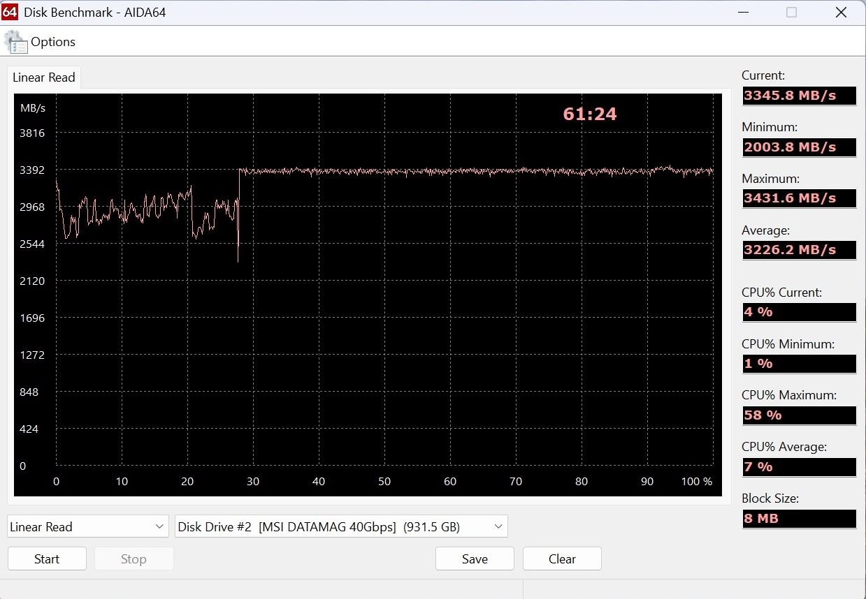 Основные тесты уже сделаны, многое из них стало понятно. К чтению вопросов нет. Там скорость стабильно где-то 4000 Мбайт/с на всём объёме. При этом 40 Гбит/с – это 5000 Мбайт/с, а тут эти циферки немного не бьются. Производитель контроллера заявляет как раз именно про 4000 Мбайт/с.