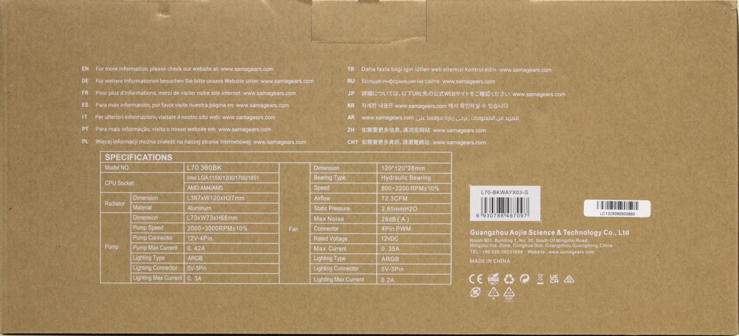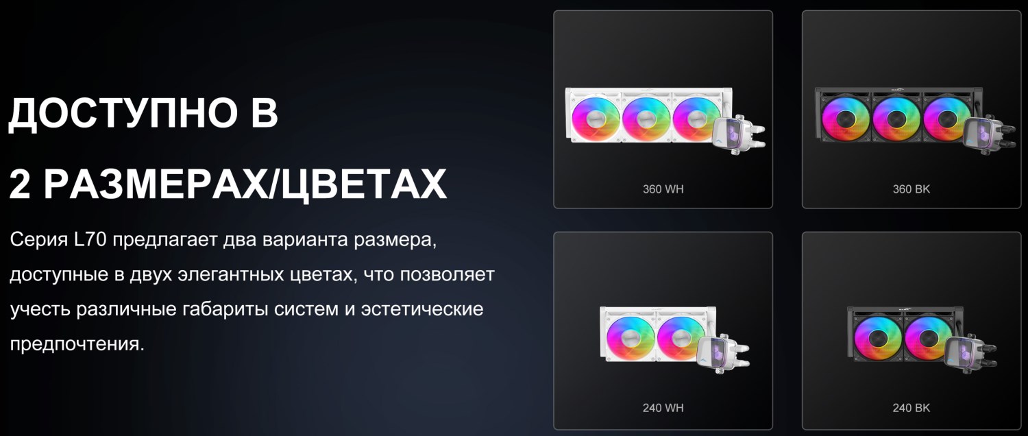 В левом нижнем крупными символами указано наименование модели L70. Само по себе оно нам ничего не сообщает. Обычно производители как-то пытаются в него запрятать размер радиатора, а точнее длину ряда вентиляторов. Здесь просто мелким шрифтом указан этот размер. В данном случае это 360 мм.