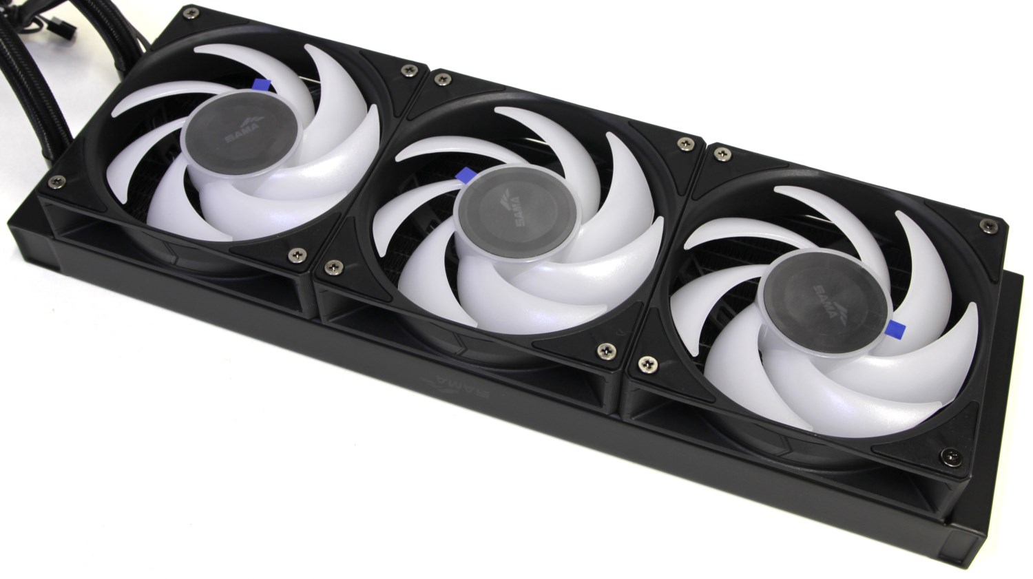 Бренд пока не очень знаменит, но я некоторое время пользуюсь блоком питания этой компании, и претензий к нему нет. До этого ещё сталкивался с воздушными кулерами SAMA и вот теперь решил попробовать AIO систему. В целом после изучения характеристик меня привлекла информация об увеличенной толщине вентиляторов. Обычно их габариты 120 х 120 х 25 мм, а тут установлены 120 х 120 х 28 мм. Стоит выяснить, как это повлияет на эффективность.