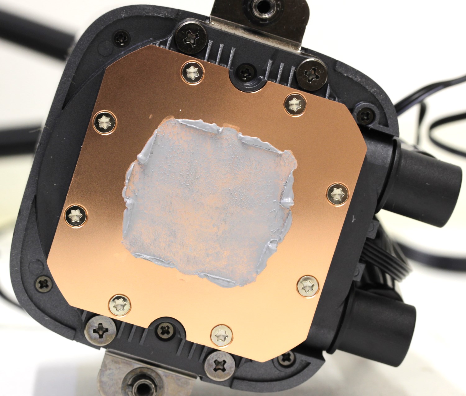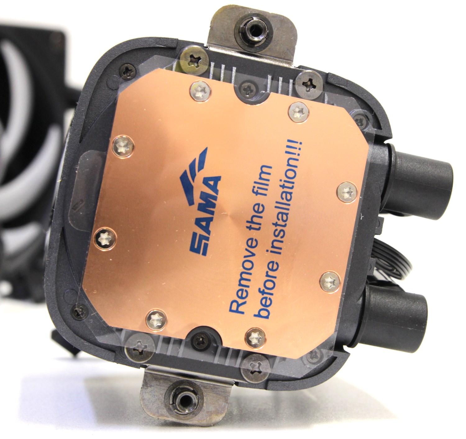 Конструкция разборная и со стороны основания можно заметить винты крепления. Изначально поверхность контакта с тепло-распределительной крышкой процессора заклеена плёнкой. Перед установкой её обязательно нужно снять, иначе показатели температуры улетят в космос.