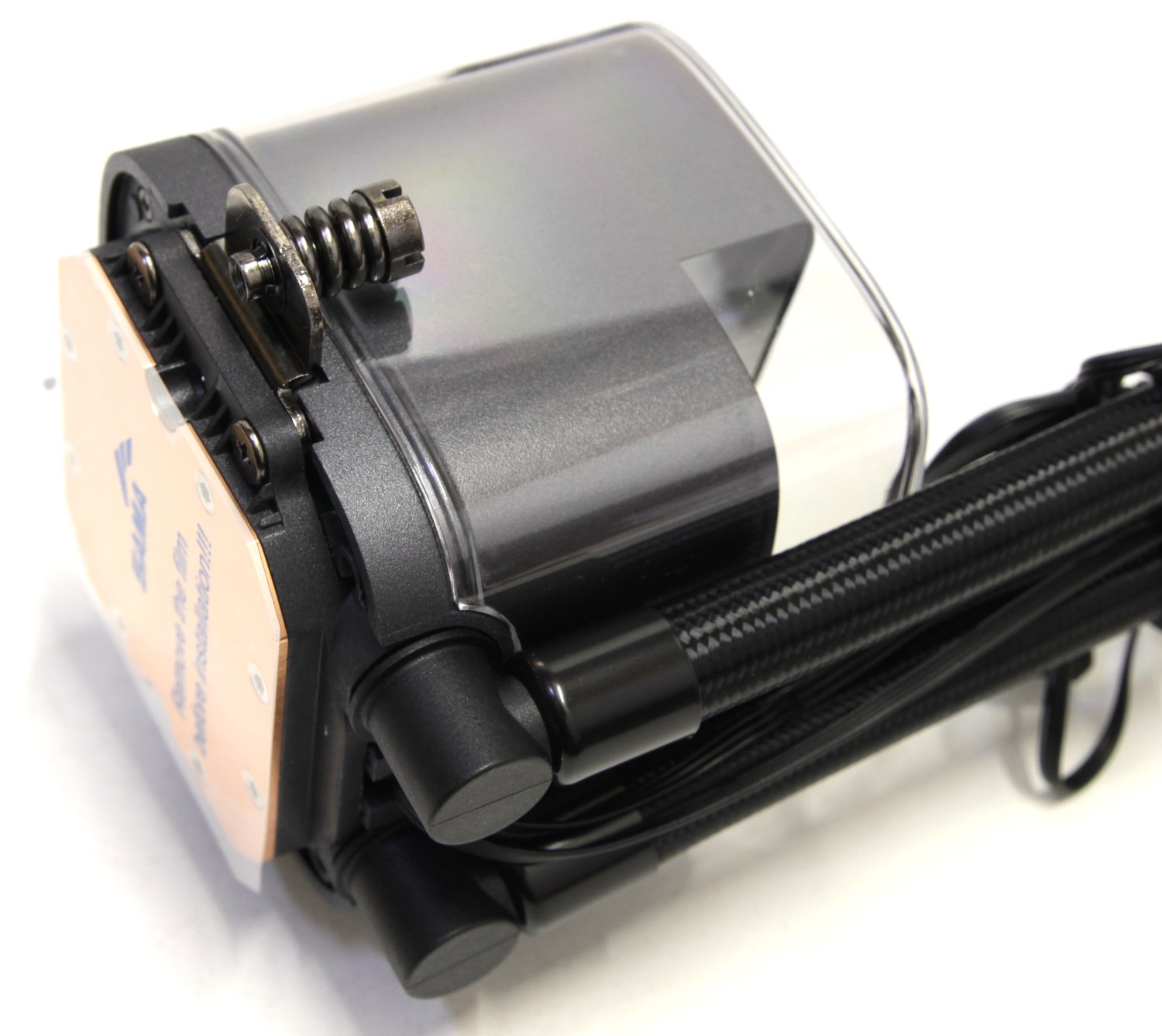 Водоблок объединён в корпус с помпой, что является классическим решением. Снаружи находится пластиковый кожух в форме прозрачного пластикового куба с скруглёнными гранями.