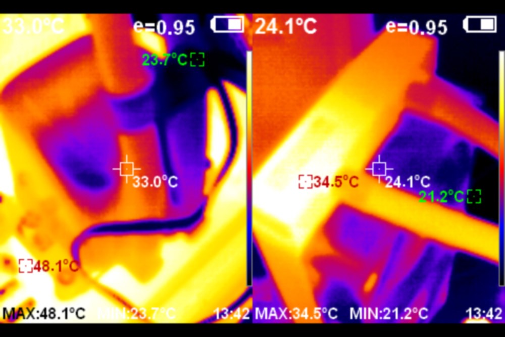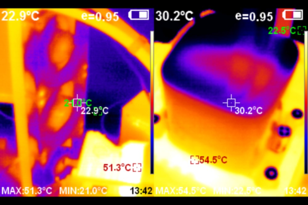 Тепловизор показывает, что сам радиатор сильно не разогревается. Видно, что один шланг горячее другого, но разница незначительна.