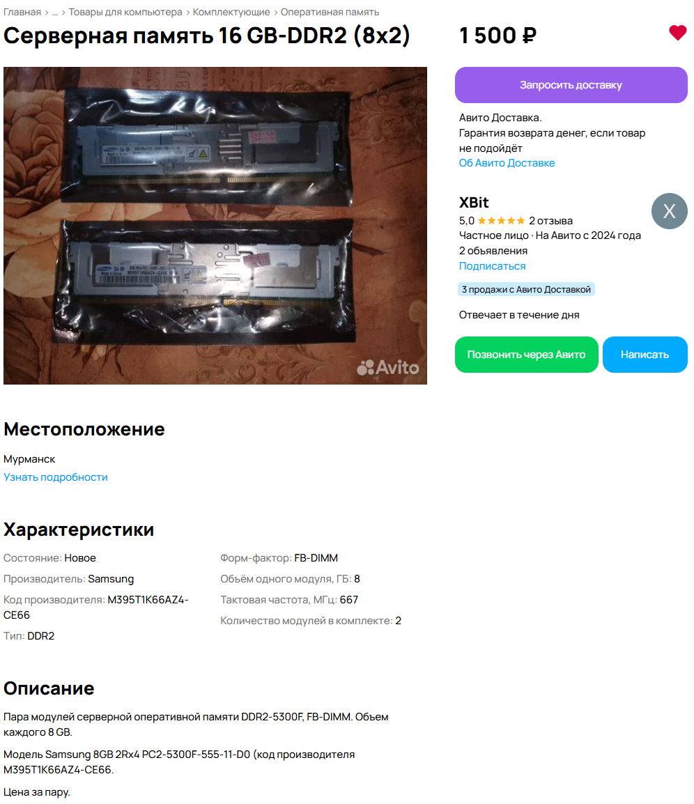 К сожалению, на Авито на момент поиска я не смог найти в продаже 16 Гбайт FB-DIMM модулей, но в завершенных сделках такие модули встречаются. Маркировка 16-гигабайтных модулей может быть как Kingston KTH-XW667/32G, так и Kingston KVR667D2Q8F5/32G. Бывают аналогичные модули под брендами Samsung, Micron, Infineon. Последняя цена была 2500 рублей за один модуль объемом 16 Гбайт.