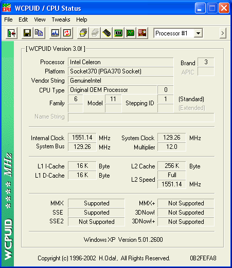 Как я и обещал, сегодня были протестированы на предмет разгоняемости процессоры Celeron на ядре Tualatin-256 старших моделей. А именно, Celeron 1.2 ГГц и Celeron 1.3 ГГц. Оба процессора имеют 256-килобайтный L2 кеш, рассчитаны на 100-мегагерцовую шину, CPU с частотой 1.2 ГГц имеет номинальное напряжение питания ядра 1.475 В, а CPU с частотой 1.3 ГГц – увеличенное до 1.5 В напряжение питания. S-spec для Celeron 1.3 ГГц – SL5VR, для Celeron 1.2 ГГц – SL5XS, степпинг ядра у обоих процессоров одинаков, A1.