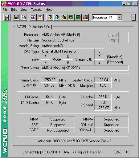 HI! Пишет Вам GNUS inc. Видел на сайте скрины WCPUID и подумал - а чем я хуже :o) На MSI KT3 Ultra из обычного АтлонаХР 1600+ (взял первый попавшийся, степпинг не помню) с повышением напряжения до 1.85В легко вышел АтлонХР 2200+ (1750МГц) - Нортвуд 1,6 отдыхает. Выше, видимо, не позволила память (Crucial PC2100) :о( При кулере GlacialTech Igloo 2400 температура не выше 52.C.