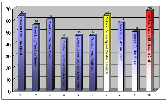 Не легче обстоит и ситуация с Pentium 4 несмотря на то, что Intel утверждает что для охлаждения их процессоров вполне хватит боксового кулера, на самом деле процессор спасается от перегрева за счёт снижения производительности. Таким образом, используя боксовый кулер и выполняя операции требующие длительной, значительной нагрузки на систему (обработка видео, компрессия больших архивов, игры и.т.д) на старших моделях P4, а особенно при разгоне. может создаться ситуация, когда за счёт перегрева процессор просто снизит свою производительность, поскольку для пользователя это всё не заметно, то он будет уверен, что его P4 отлично охлаждается, в то время как на самом деле, это не совсем так. Кроме того, процессоры Intel при соответствующем охлаждении великолепно разгоняются.