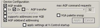 это включение/выключение AGP; скорость передачи данных, поддержка Fast Writes, Sideband Addressing; поддержку адресов выше 4 ГБ; максимальное количество запросов команд по AGP, изменение палитры VGA и уже знакомые кнопки [Apply], [Cancel], [apply settings at V.Control startup].