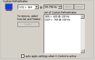 В разделе [Custom Refreshrates] выберите видеорежим для установки частоты обновления из списка и установите для него собственную частоту из переключателя правее, нажмите [Apply]. Выбранный видеорежим и частота будут протестированы (как и при разгоне) и будет запрошено подтверждение (нажмите ОК для сохранения изменений). В список [List of Custom Refreshrates] будет добавлен выбранный видеорежим. Включите чекбокс [auto apply settings when V.Control is active] для автоматического применения указанных видеорежимов.
