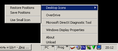 Где пункт [Desktop Icons] открывает подменю с пунктами [Restore Positions] - восстановить положение иконок рабочего стола, [Save Positions] - сохранить положение иконок рабочего стола (эти два особенно полезны при частой смене видеорежимов, когда иконки хаотически смещаются), [Use Small Icon] - использовать для рабочего стола маленькие иконки (примерно через месяц после свежей установки Windows мне начинает хотеться воспользоваться этой функцией :).