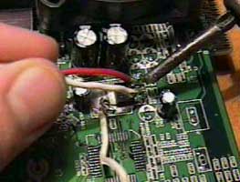 - Подпаиваем к этим выводам провода подлиннее, ставим карточку обратно. Провода: красный – это входной вывод (его можно не подпаивать), белый с узлом – управляющий, белый – выходной вывод.
