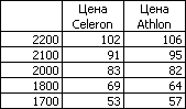 Теперь ясно видно, что цены на Barton 2800+ и 3000+ (пока писалась эта статья, модель 2600+ упала в цене до приемлемого уровня) необходимо снизить хотя бы на 10%, иначе они не будут продаваться совсем. Я конечно понимаю, что выход кристаллов на частоте больше 2ГГц невелик, но он есть и такие процессоры надо продавать. А когда цены на них сопоставимы с Pentium4, по упоминавшимся выше причинам покупатель предпочтёт именно Pentium4. Как гласит народная мудрость, лучше синица в руке... На процессор с рейтингом 2400 AMD установила очень правильную цену, а вот ниже начинается тот самый непорядок: модель 2200+ могла бы прекрасно продаваться по цене порядка $130, однако она стоит всего $106. И причина, по которой AMD так занижает цены – Celeron.