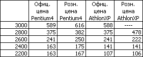 Недавно произошло обоюдное снижение цен на процессоры, после которого мы можем напрямую сравнить цены на Pentium4 и Athlon XP.
