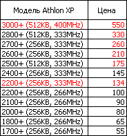 Как видите, Intel ускоренными темпами сворачивает производство младших моделей Pentium4, в то время как AMD продолжает продавать младшие модели по бросовым ценам! И это притом, что выход кристаллов, годных хотя бы для рейтинга 2000+ огромен!!! Это вторая ошибка AMD на сегодняшний день. По-хорошему, AMD надо сделать младшей моделью Athlon XP 2000+, установив на него цену около $100, тогда как сегодняшняя цена на эту модель составляет менее 85 долларов. Если свести в одну таблицу все данные о ценах (розничные цены в основном брались из прайса Ф-Центра), то увидим следующее: