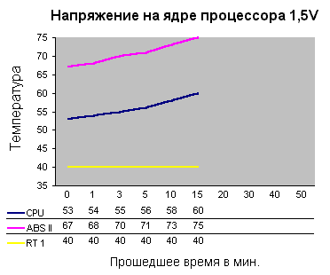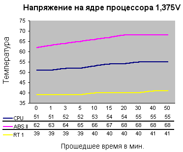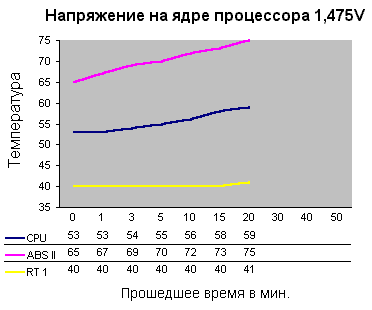 Тестирование проводилось под OS Win 2k Pro, показания с внутреннего термодатчика процессора и с материнской платы снимались прикладывающейся в комплекте утилитой “Soltek HM”. Для разогрева процессора и определения его стабильной работы использовалась программа для 3D дизайна 3D Studio MAX v.3 и тестовая программа 3D Mark 2001. Максимальным значением для внутреннего термодатчика микропроцессора было принято +75С. При достижении этого значения компьютер автоматически выключался, тестирование на несколько минут останавливалось, и при следующем включении напряжение на ядре микропроцессора понижалось на 0,025 V. Температура в помещении, где проводились тесты, была +19-+22 С.