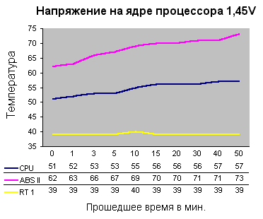 При первом включении были сделаны определенные настройки в BIOS материнской платы: критическая температура на внутреннем датчике ABS II установлена на уровне +75С и понижено напряжение на ядре процессора до 1,5 V.