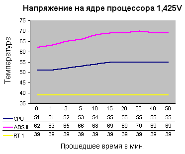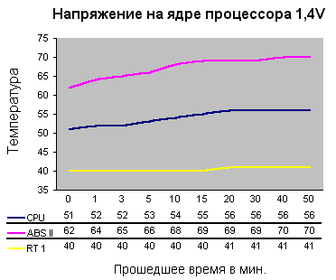 - Нагрев процессора происходит уже достаточно плавно, и, проработав почти час, температура не поднялась выше +70 С.