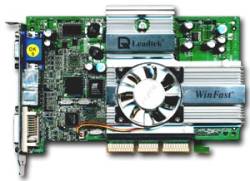 Интерфейс: 2х/4x GPU: 250 МГц Память: 64 МБ DDR SDRAM, модули Hynix с временем цикла 4 нс (что соответствует частоте работы 275 (550) МГц), установленные с обеих сторон. Работает на частоте 250 (500) МГц Оснащение: DVI, Video-Out Охлаждение: массивный радиатор покрывает как чип, так и память Комплект поставки: руководство пользователя, диск с п/о и утилитами, переходник-разветвитель VIVO, переходник DVI-to-d-Sub Разгоняемость: 250/512 -> 330/600 MГц, удовлетворительный разгон Негативные особенности: завышенная цена Позитивные особенности: качественный продукт, удовлетворительный разгон, массивный радиатор (с обеих сторон), хорошее качество 2D Итог: Высокое качество и высокая производительность, надежность – критерии, по которым можно определить продукты Leadtek. В отличие от WinFast A280LE TDH MyVIVO имеет менее мощную память и как следствие – меньшую разгоняемость. Как и остальные продукты от Leadtek, одетый в «доспехи». Продукт не отличается от своих оппонентов, имеет слабый показатель разгона и завышенную цену. Но ценители «творчества» Leadtek – не разочаруются.