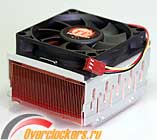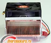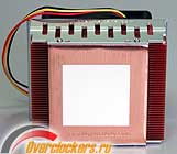 У Thermaltake - P4 Spark 5+ такой же медный радиатор 82х65х35.5 мм, но термоинтерфейс Shin Etsu (X-23-7762). Термосопротивление 0.29 C/W. Вентилятор 70х70х15 мм с двумя подшипниками, скорость вращения - 4700 об./мин., воздушный поток - 41 CFM, шум - 41dBA. В комплекте также прилагается панель для крепления кулера на плату.