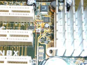 - с помощью проволочных перемычек в процессорном соккете стартовое напряжение питания процессора выставляем равным 1,85В (исчерпав возможности BIOSа, оно остаётся и единственным);