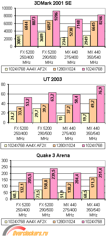 Тесты на обеих видеокартах проводились сначала на номинальных частотах с разрешением 1024х768, 1280х1024 и 1024х768 с Antialiasing 4Х и Anisotropic Filtering 2Х. Полноценный тест 3Dmark 2003 v.3.3.0 для GeForce 4 MX440-8X мне провести не удалось из-за отсутствия поддержки DirectX 9 у этой карты. Из всего списка мне предлагалось только Wings of Fury, Fill Rate (Singl - Texturing) и Fill Rate (Multi - Texturing). В 3Dmark 2001 SE использовались настройки качества по умолчанию, в Quake 3 Arena крутилась демка Four, а в UT 2003 демка flyby-inferno.