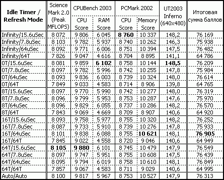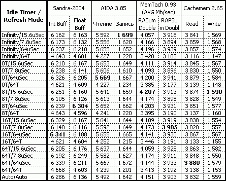 Ну что можно сказать? "Невооруженным глазом" видно, что изменение параметра "DRAM Idle Timer" – практически не влияет на производительность системы на чипсете Intel-865PE, а вот изменение "DRAM Refresh Mode" довольно заметно. Это особенно видно, при выставлении его в значение "64Т", при котором производительность падает примерно на 15-17%! А максимальная производительность достигается не при его наименьшем значении (7.8uSec), как предполагалось выше, а при "64uSec".