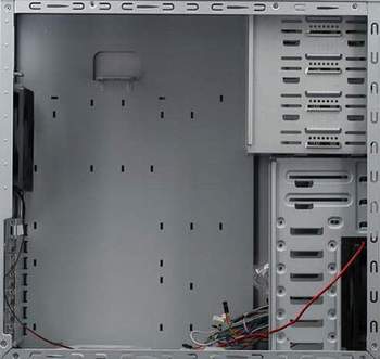 Единственный отсек для флоппи дисковода так же скрыт панелькой. Достаточно спорное решение оставить пользователя без свободного 3,5 дюйма отсека (который мог бы использоваться для считывателя карт памяти и т.д.) можно объяснить только странным ходом дизайнерской мысли :(.