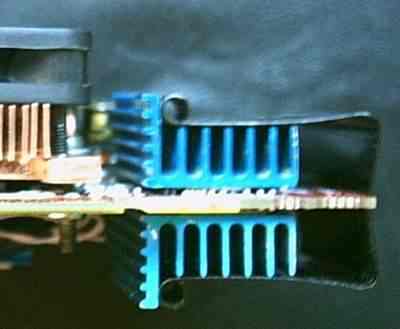 Чтобы радиатор плотно прилегал к видеочипу, пришлось основательно его "доработать". Я спилил несколько рёбер, сточил пару мешающих углов, и ... процессорный Spire стоит как влитой! Не думаю, что лишившись части своего медного брюха, он сильно потерял в производительности. Просверлив два отверстия, я продел шурупы через них и специальные отверстия в текстолите. Чтобы не повредить видеокарту, и ничего не замкнуть, были использованы картонные "шайбы" между текстолитом и головкой болта.