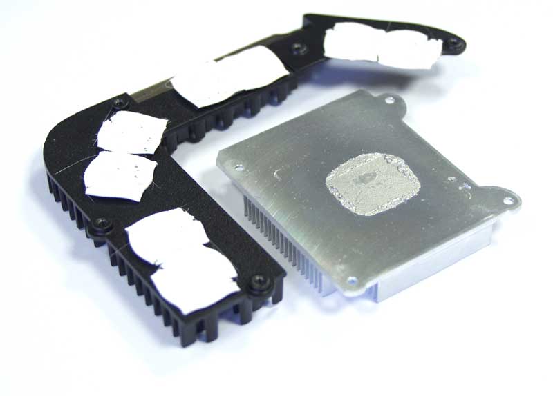 Тепловой контакт с графическим процессором осуществляется посредством термопасты, а с микросхемами видеопамяти – с помощью толстых теплопроводящих «подушек»: