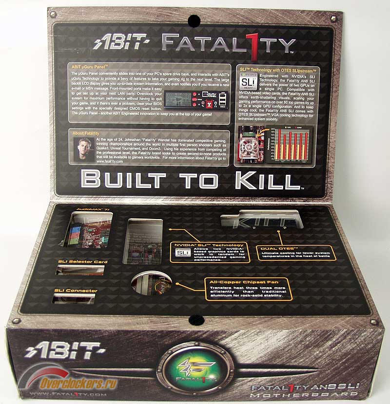 За последние годы упаковки материнских плат стали в полтора-два раза толще, нередко они раскрываются, как книжка, позволяя на развороте разместить максимум информации об особенностях платы. Abit даже здесь сумел выделиться, разворот не просто рассказывает, но и показывает эти особенности – окошки в упаковке приглашают наглядно рассмотреть некоторые характерные детали платы и её комплектации.