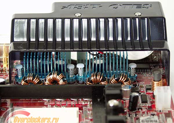 Прежде всего обращает на себя внимание система охлаждения OTES, где под пластиковым кожухом скрываются радиаторы на MOSFET.