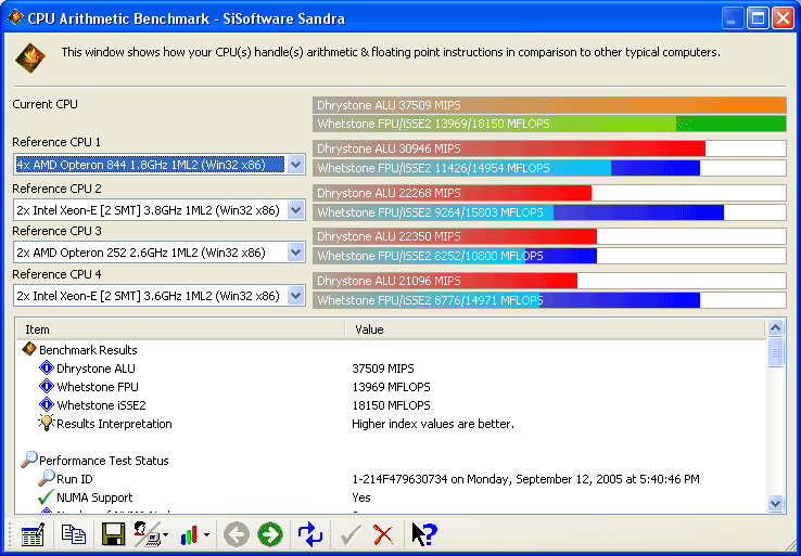 Судя по полученным показателям, наша рабочая станция обладает колоссальным запасом мощности. Особенно радует результат измерения пропускной способности памяти. Вот она, технология NUMA в действии. Что же касается результатов арифметических тестов, то и они способны подарить поклонникам AMD несколько приятных минут. Алгоритмы, применённые в бенчмарках SiSoft Sandra 2005, хорошо распараллеливаются. Поэтому наша система, в которой применены двухъядерные CPU, способна обгонять даже обычные четырёхпроцессорные платформы, не говоря уж о двухпроцессорных системах, основанных на CPU семейства Intel Xeon.