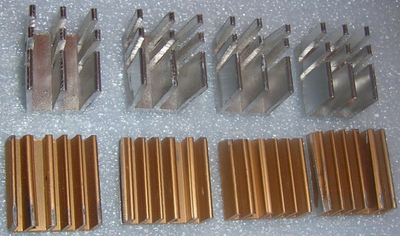 Для изготовления первой половины радиаторов был использован радиатор, идущий в комплекте с Celeron 300A Slot1. Ему просто были отпилены "уши", а затем распилены еще на две части. Для второй половины был взят радиатор от кулера под Pentium1, он был распилен на 4 части. Вот, что получилось в результате: