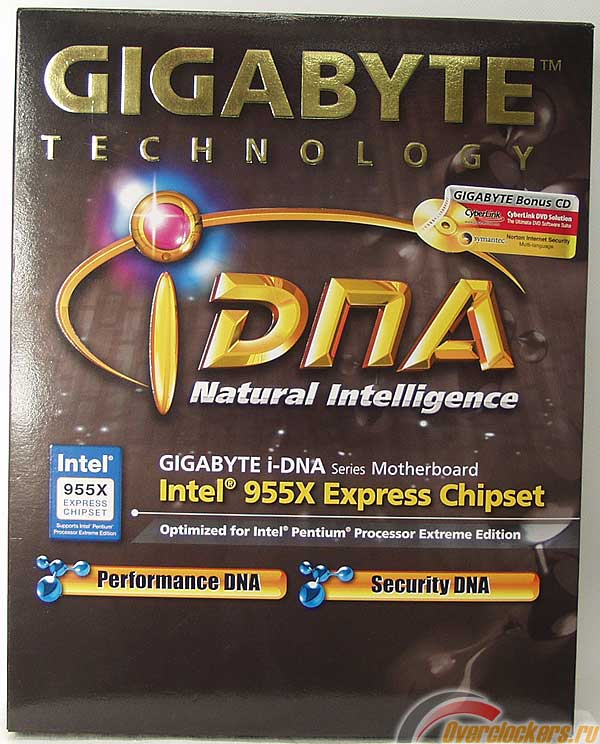 На упаковке, как это сейчас принято для топовых плат, имеется масса справочной информации, в том числе и довольно интересной. Однако к изучению этих аспектов мы вернёмся позже, а пока смотрим на саму плату GIGABYTE GA-8I955X Pro.