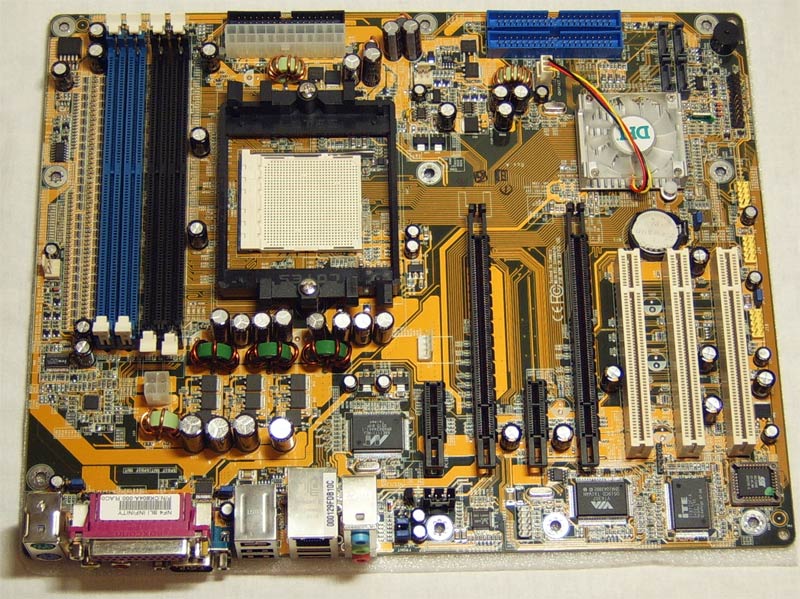 Теперь перейдём к самому интересному – к разгону. Использовался А64 3000+ (Venice), множитель процессора установили равным 5х, множитель HT – x3, память – как DDR 100, на всякий случай, чтобы избежать её влияния. Запускаем плату на частоте тактового генератора 290 МГц – ноль реакции: плата даже не завелась, хотя BIOS сбрасывать не пришлось, т. к. плата рестартовала сама. Пробуем 260 МГц – удачный старт, конечная стабильная частота была равна 270 МГц (прохождение тестов S&M, Prime 95, SuperPi) – слишком мало по сегодняшним временам, когда платы покоряют и 400, а для разгона А64 3000+ надо хотя бы 300 МГц. Я начал искать источник проблемы и быстро нашел его. Многие, наверное, уже догадались – это кулер чипсета: при установке платы в корпус на нём нельзя было держать руку больше пары секунд. Выход один – смена системы охлаждения чипсета. Снимаем кулер и видим: